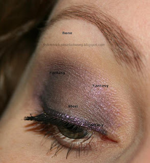 Bei dem trüben Wtter muss ein bisschen Farbe an die Augen, vor allem beim Lidstrich darf es knallen. Daher wurde das Sleek-Pigment Fantasy dort feucht aufgetragen. Ansonsten kam nur noch der Cremelidschatten Steel von Bobbi Brown zum Einsatz.